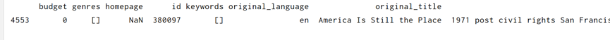 print(df_tmdb_5000_movies[df_tmdb_5000_movies['release_date']!=df_tmdb_5000_movies['release_date']])#输出指定列为控制的行