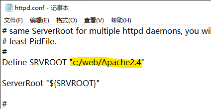 4,查找 DocumentRoot ,修改网站根目录(默认为:DocumentRoot "${SRVROOT}/htdocs")