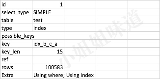 表示相应的select操作中使用了覆盖索引,避免访问了表的数据行,效率不错。如果同时出现using where,表明索引被用来执行索引键值的查找;如果没有同时出现using where,表明索引用来读取数据而非执行查找动作。