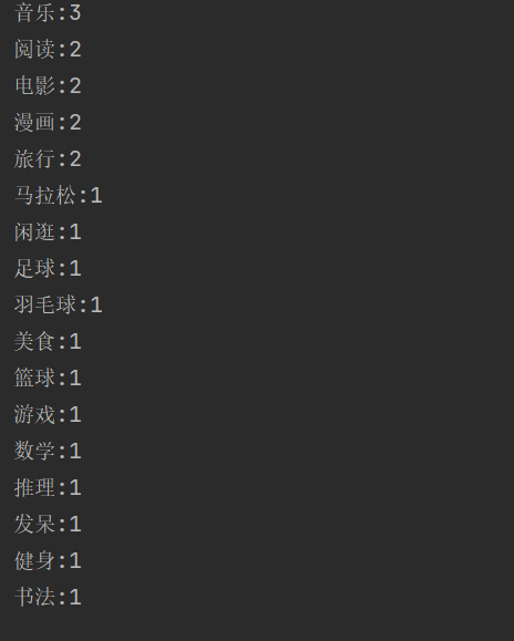 datas = {'2049777001': ['篮球', '羽毛球', '美食', '漫画'],