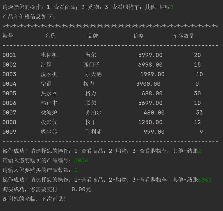 """ 家用电器销售系统 v1.4 """ #欢迎信息 print('欢迎使用家用电器销售系统!') #商品数据初始化 products=[ {'id':'0001','name':'电视机','brand':'海尔','price':5999.00,'count':20}, {'id':'0002','name':'冰箱','brand':'西门子','price':6998.00,'count':15}, {'id':'0003','name':'洗衣机','brand':'小天鹅','price':1999.00,'count':10}, {'id':'0004','name':'空调','brand':'格力','price':3900.00,'count':0}, {'id':'0005','name':'热水器','brand':'格力','price':688.00,'count':30}, {'id':'0006','name':'笔记本','brand':'联想','price':5699.00,'count':10}, {'id':'0007','name':'微波炉','brand':'苏泊尔','price':480.00,'count':33}, {'id':'0008','name':'投影仪','brand':'松下','price':1250.00,'count':12}, {'id':'0009','name':'吸尘器','brand':'飞利浦','price':999.00,'count':9}, ] #初始化用户购物车 products_cart=[] option=input('请选择您的操作:1-查看商品;2-购物;3-查看购物车;其他-结账') while option in['1','2','3']: if option=='1': #产品信息列表 print('产品和价格信息如下:') print('**************************************************************') print('%-10s'%'编号', '%-10s'%'名称', '%-10s' %'品牌', '%-10s'%' 价格', '%-10s'%'库存数量') print('--------------------------------------------------------------') for i in range(len(products)): print('%-10s'%products[i]['id'],'%-10s'%products[i]['name'], '%-10s'%products[i]['brand'],'%10.2f'%products[i]['price'], '%10d'%products[i]['count']) print('--------------------------------------------------------------') elif option=='2': product_id=input('请输入您要购买的产品编号:') while product_id not in [item['id'] for item in products]: product_id=input('编号不存在,请重新输入您要购买的产品编号:') count=int(input('请输入您要购买的产品数量:')) while count>products[int(product_id)-1]['count']: count=int(input('数量超出库存,请重新输入您要购买的产品数量:')) #将所购买商品加入购物车 if product_id not in [item['id'] for item in products_cart]: products_cart.append({'id':product_id,'count':count}) else: for i in range(len(products_cart)): if products_cart[i].get('id')==product_id: products_cart[i]['count']+=count #更新商品列表 for i in range(len(products)): if products[i]['id']==product_id: products[i]['count']-=count else: print('购物车信息如下:') print('******************************') print('%-10s'%'编号','%-10s'%'购买数量') print('------------------------------') for i in range(len(products_cart)): print('%-10s'%products_cart[i]['id'],'%6d'%products_cart[i]['count']) print('------------------------------') option=input('操作成功!请选择您的操作:1-查看商品;2-购物;3-查看购物车;其他-结账') #计算金额 if len(products_cart)>0: amount=0 for i in range(len(products_cart)): product_index=0 for j in range(len(products)): if products[j]['id']==products_cart[i]['id']: product_index=j break price=products[product_index]['price'] count=products_cart[i]['count'] amount+=price*count if 5000<amount<=10000: amount=amount*0.95 elif 10000<amount<=20000: amount=amount*0.90 elif amount>20000: amount=amount*0.85 else: amount=amount*1 print('购买成功,您需要支付%8.2f元'%amount) #退出系统 print('谢谢您的光临,下次再见!')