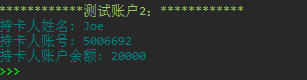 1 class Account: 2 3 def __init__(self, name, account_number, initial_amount = 10): 4 self._name = name 5 self._card_no = account_number 6 self._balance = initial_amount 7 def deposit(self, amount): 8 self._balance += amount 9 def withdraw(self, amount): 10 if self._balance < amount: 11 print('余额不足') 12 return 13 14 self._balance -= amount 15 16 def info(self): 17 print('持卡人姓名:', self._name) 18 print('持卡人账号:', self._card_no) 19 print('持卡人账户余额:', self._balance) 20 def get_balance(self): 21 return self._balance 22 def main(): 23 print('测试账户1:'.center(30, '*')) 24 a1 = Account('Bob', '5002311', 20000) 25 a1.deposit(5000) 26 a1.withdraw(4000) 27 a1.info() 28 print() 29 print('测试账户2:'.center(30, '*')) 30 a2 = Account('Joe', '5006692', 20000) 31 a2.withdraw(10000) 32 a2.withdraw(5000) 33 a2.info() 34 if __name__ == '__main__': 35 main()