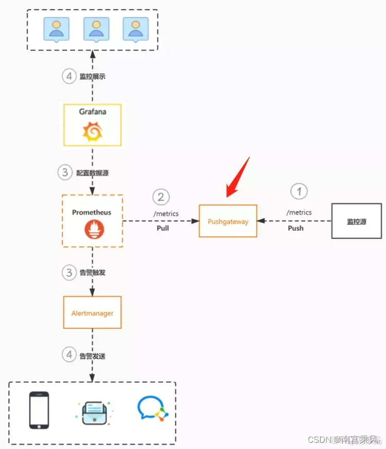 Pushgateway为Prometheus整体监控方案的功能组件之一,并做于一个独立的工具存在。它主要用于Prometheus无法直接拿到监控指标的场景,如监控源位于防火墙之后,Prometheus无法穿透防火墙;目标服务没有可抓取监控数据的端点等多种情况。
