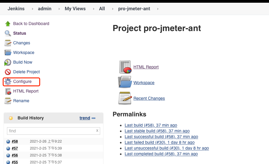 进入jenkins 对应的jmeter自动化的Job中,点击Configure,我们去修改一下当时的配置,