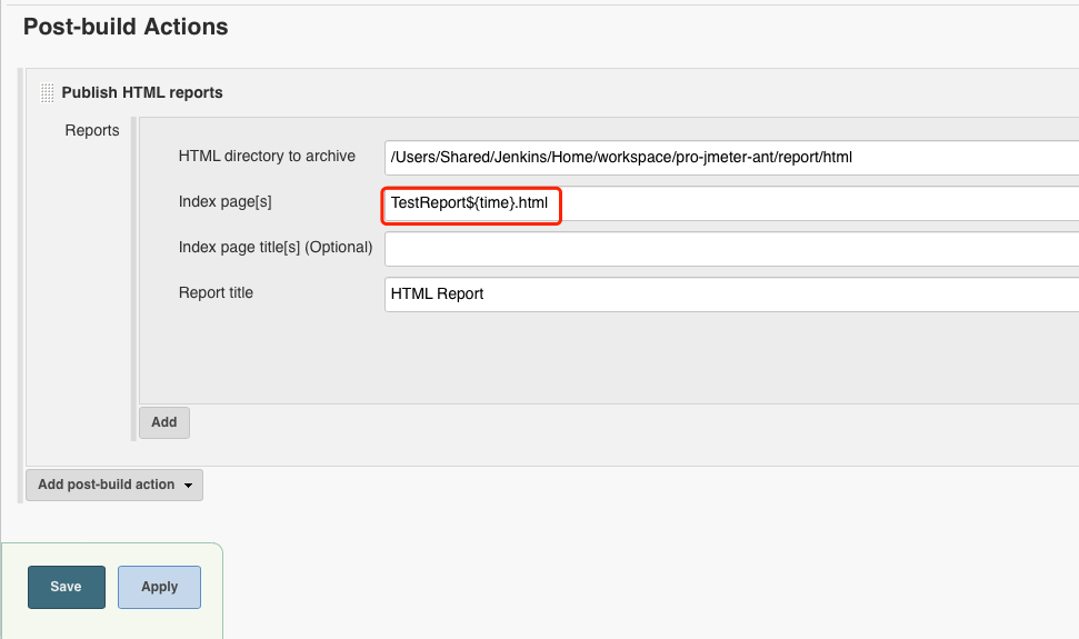 修改构建后操作(Post-build Actions),将原先设置的index.html改成和 TestReport${time}.html,点击save