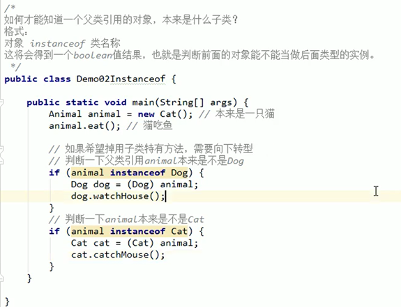 特别注意:向下转型一定要做instanceof类型判断,否则有可能会发生异常。ClassCastException