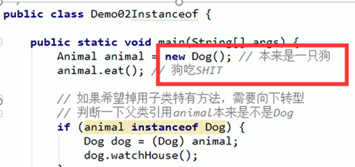 问题:本来想用狗的方法,为什么还要向上转型?向上转、向下转两种格式都知道,但是你这个代码好像没有意义,只有演示的意义,确实如此,