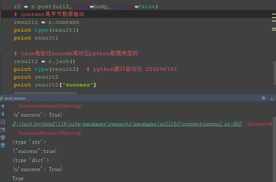 3.如果经过json解码后,返回的就是一个字典:{u'success': True},这样获取后面那个结果,就用字典的方式去取值:result2["success"]