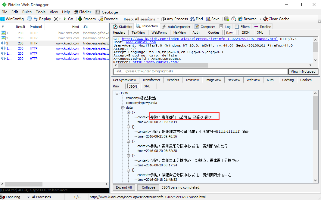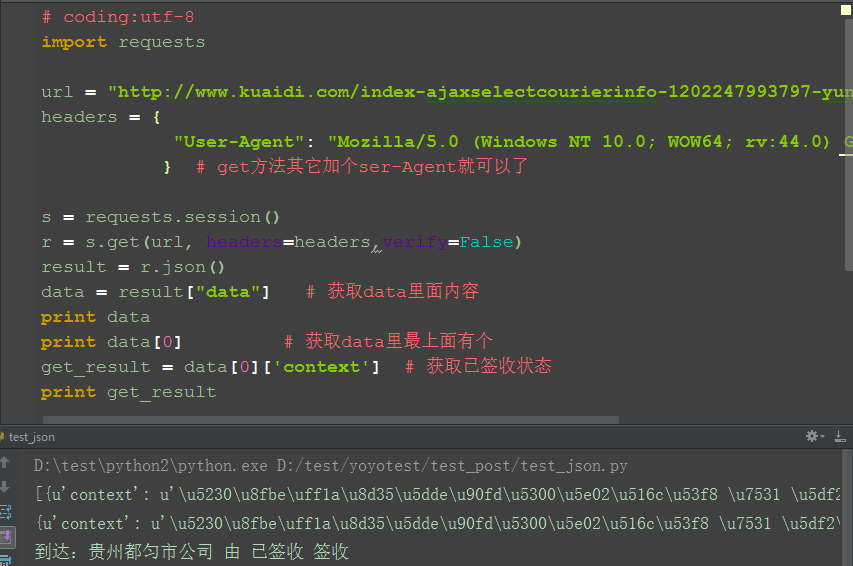 # coding:utf-8 import requests url = "http://www.kuaidi.com/index-ajaxselectcourierinfo-1202247993797-yunda.html" headers = { "User-Agent": "Mozilla/5.0 (Windows NT 10.0; WOW64; rv:44.0) Gecko/20100101 Firefox/44.0" } # get方法其它加个User-Agent就可以了 s = requests.session() r = s.get(url, headers=headers,verify=False) result = r.json() data = result["data"] # 获取data里面内容 print data print data[0] # 获取data里最上面有个 get_result = data[0]['context'] # 获取已签收状态 print get_result if u"已签收" in get_result: print "快递单已签收成功" else: print "未签收"