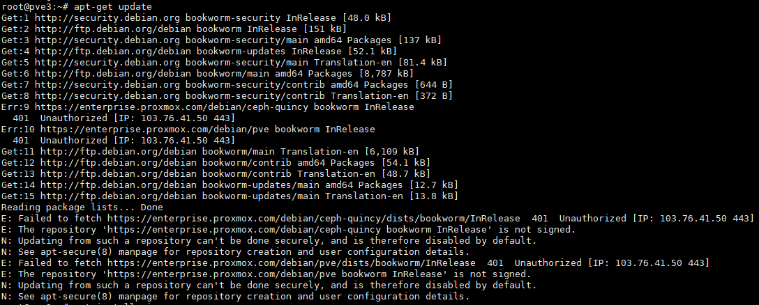 pve在执行apt-get update 更新软件包时报错:E: Failed to fetch https://enterprise.proxmox.com/debian/ceph-quincy/dists/bookworm/InRelease 401 Unauthorized [IP: 103.76.41.50 443]
