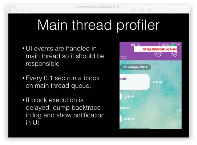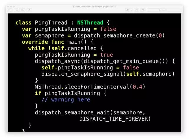 Viber 的开发者描述了另一种方法。他们有一个特殊的线程用来监视主线程,并监测主线程的阻塞不会超过 400 毫秒。