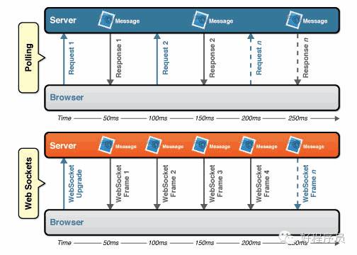 而Websocket的Frame是 just two bytes of overhead instead of 871,仅仅用2个字节就代替了轮询的871字节!