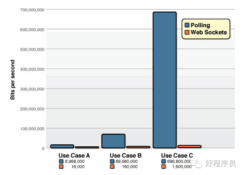 上图就是Websocket和Polling的区别,从图中可以看到Polling里面客户端发送了好多Request,而下图,只有一个Upgrade,非常简洁高效。至于消耗方面的比较就要看下图了