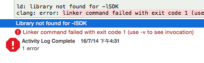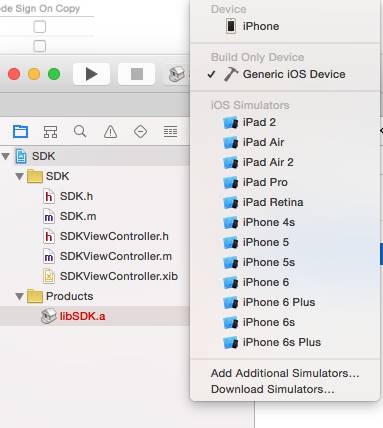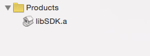 选择真机或者Geneic iOS Device编译,原本红色的libSDK.a就变成灰色,表示文件存在。
