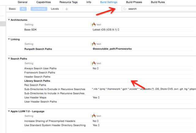 然后配置一下,选择在配置里搜索search,如果里面的library search paths为空,那么双击空处箭头的地方给它添加一个库的寻找路径,给.a文件路径如 $(PROJECT_DIR)/text/libSDK.a