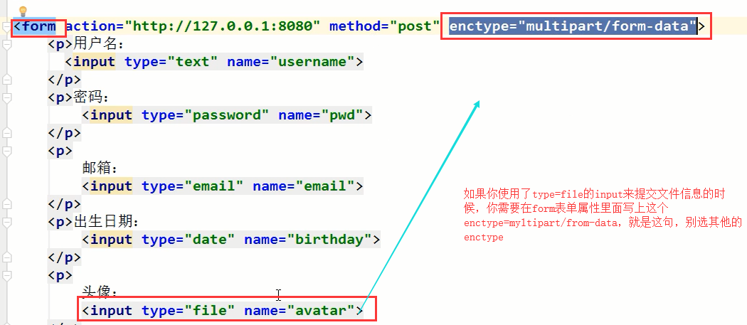 还有一个文件input:因为我们刚才说,数据是通过组成一个字典发给后端的,但是文件怎么做键值对啊,做不了,所以需要通过二进制流的形式一点一点的传送给后端,就是这个multipart搞的事情,有个了解就行了,别纠结,到了django我们在细说。