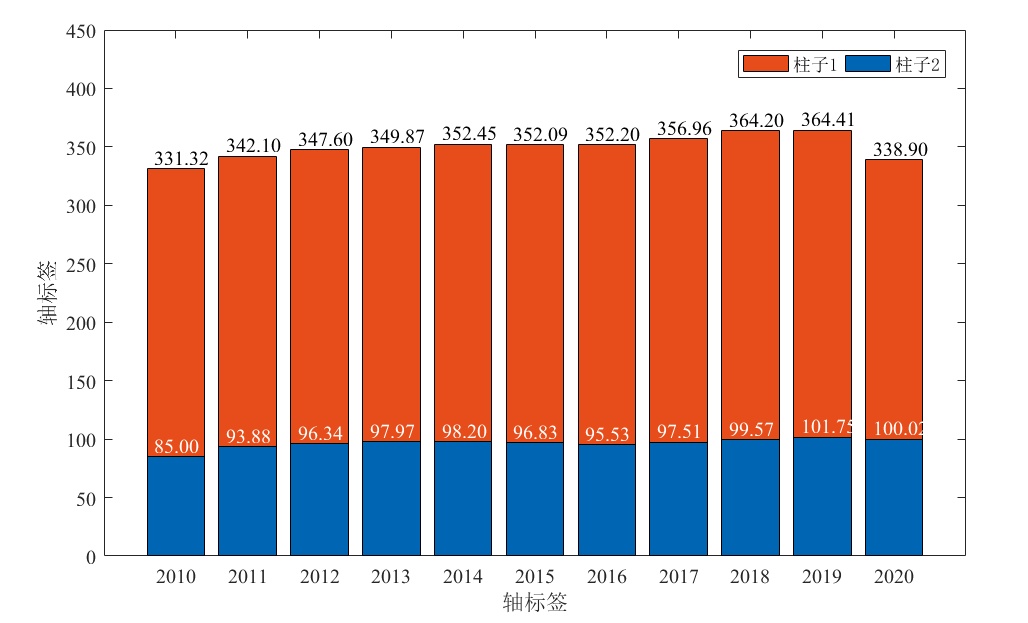 data=[2010 85.005 331.319 2011 93.882 342.096 2012 96.339 347.600 2013 97.965 349.873 2014 98.204 352.449 2015 96.832 352.094 2016 95.525 352.204 2017 97.507 356.963 2018 99.566 364.197 2019 101.747 364.414 2020 100.017 338.905]; %% 建立数据 bar(data(:,3),'FaceColor',[0.9 0.3 0.1]) %% 柱状图 hold on bar(data(:,2),'FaceColor',[0 0.4 0.7]) set(gca,'fontname','times new roman') %% 图片字体为新罗马 set(gca,'xticklabel',num2str(data(:,1))) %% 设置x轴刻度标签 for i=1:11 text(i-0.3,data(i,2)+10,num2str(data(i,2),'%.2f'),'color','w','fontname','Times New Roman') %% 将数据标注到柱子上,颜色为白色,字体为新罗马 text(i-0.3,data(i,3)+10,num2str(data(i,3),'%.2f'),'fontname','Times New Roman') end legend({'\fontname{宋体}柱子一','\fontname{宋体}柱子二'},'Orientation','horizontal','Location','northeast') %% 添加横向图例('horizontal'); 位置在东北向,