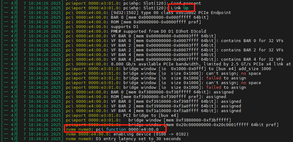步骤一:NVMe盘上电,通过dmesg命令查看内核日志(识别成功会打印Link Up、nvme设备id、pci设备号)
