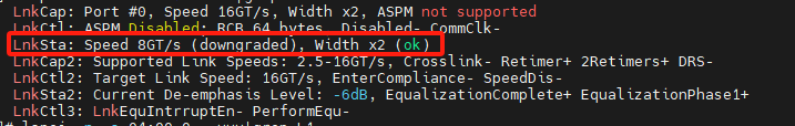 1 lspci |grep Non-Volatile #确认NVMe设备的PCIe号 2 3 lspci -n -s e4:00.0 -vvv |grep Lnk #查看速率