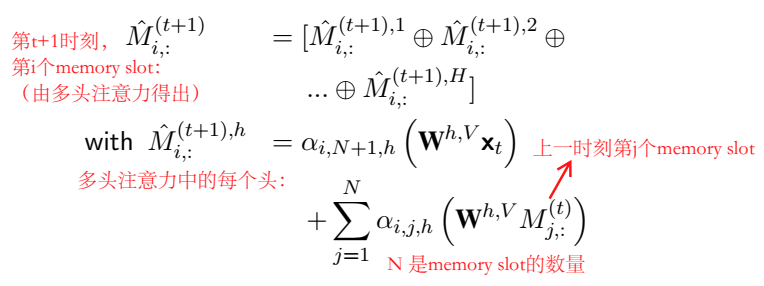 假设一个记忆为 M,它有 N 行,每一行是一个 memory slot。第 t+1 个时刻,第 i 个 memory slot 的值由多头注意力计算得出: