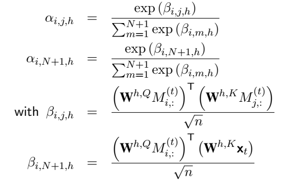 其中,H 是 attention 头的数量,n 是 head size,memory size k=nH。attention 权重由如下的 softmax 函数及缩放点积计算得出: