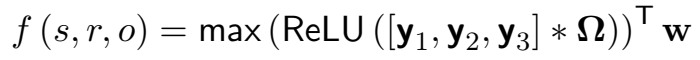 max 代表 max-pooling 操作,代替了 ConvKB 中的向量拼接,可以从 feature map 中捕捉到更重要的特征,并减少权重参数。