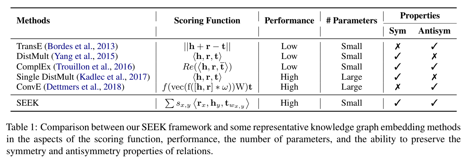 小结: 本文提出了 SEEK(Segmented Embedding for KG),通过对 embedding 进行分段,利用充分的特征交互(还是没看出来),保留了对称和非对称的关系特性。思想没有太高明的地方,本质就是分段,然后进行排列组合,我的那篇烂论文跟这篇有异曲同工之处,或许后面可以借鉴这篇文章改进一下复杂度。