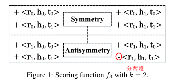 f2 只能建模对称的关系,因为 \(f_2(h,r,t) == f_2(t,r,h)\)。为了建模非对称关系,将关系的分段分为奇数部分和偶数部分,奇数段捕捉对称特性,偶数段捕捉非对称特性。打分函数定义为: