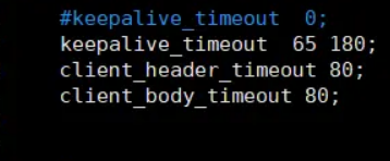 vim /usr/local/nginx/conf/nginx.conf http { ...... keepalive_timeout 65 180; //设置连接超时时间