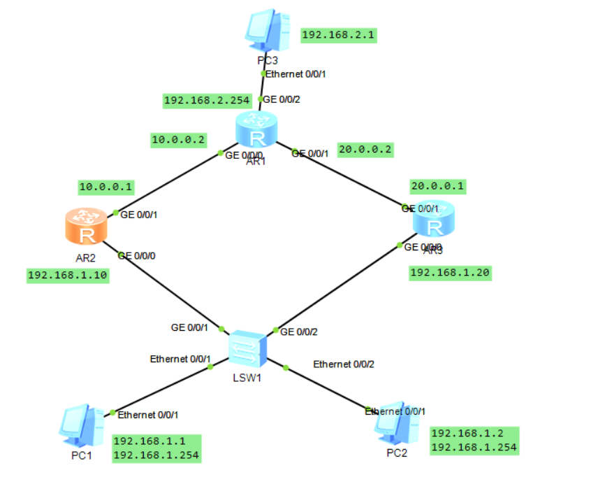 PC2、PC3通过交换机sw1连接到路由R1。为了提高可靠性,增加两台路由器R2、R3作为双出口连接到R1,在双网关的情况下,如果在PC 上配置R2 或R3 的真实IP 地址作为网关,当其中一台路由器故障时,就需要手动更改PC 的网关IP, 若网络中有大量PC 则需要耗费大量时间和人力去更改配置,且会带来一定时间的断网影响。为了能够使故障所造成的断网影响达到最小化,增强网络的可靠性,网络管理员在R2 与R3 之间部署VRRP 协议,这样当任一网关发生故障时就能自动切换而无需更改PC 的网关IP 地址。(这里我们为了增加难度,在R1后连接一台PC,用PC2、PC3来连接PC1)