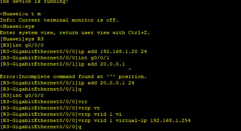 [R3-GigabitEthernet0/0/0]vrrp vrid 1 virtual-ip 192.168.1.254 ***创建VRRP 备份组,配置虚拟IP