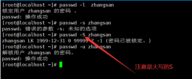 [root@localhost ~]# passwd -l zhangsan //锁定用户zhangsan的密码 锁定用户 zhangsan 的密码 。 passwd: 操作成功 [root@localhost ~]# passwd -S zhangsan //查看zhangsan状态 zhangsan LK 2022-07-31 0 99999 7 -1 (密码已被锁定。) [root@localhost ~]# passwd -u zhangsan //解锁用户zhangsan的密码 解锁用户 zhangsan 的密码。 //由于用户zhangsan密码为空 passwd: 警告:未锁定的密码将是空的。 passwd: 不安全的操作(使用 -f 参数强制进行该操作)