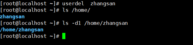 [root@localhost ~]# userdel zhangsan [root@localhost ~]# ls /home/ zhangsan [root@localhost ~]# ls -d1 /home/zhangsan /home/zhangsan