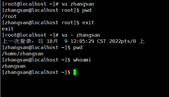 [root@localhost ~]# su zhangsan [zhangsan@localhost root]$ pwd /root [zhangsan@localhost root]$ exit exit [root@localhost ~]# su - zhangsan 上一次登录:六 8月 13 14:48:54 CST 2022pts/1 上 [zhangsan@localhost ~]$ pwd /home/zhangsan