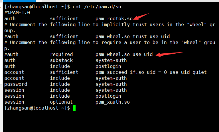 - 两行都注释是允许所有用户都能使用su命令,但root使用su切换到其他普通用户需要输入密码;如果第一行不注释,则root使用su切换普通用户就不需要输入密码(pam rootok. so模块的主要作用是使uid为0的用户,即root用户能够直接通过认证而不用输入密码)。
