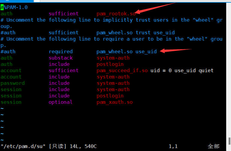 - 启用pam_wheel认证模块。则只有wheel组内的用户可以使用su命令切换用户。