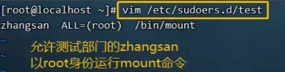 [root@localhost ~]# vim /etc/sudoers.d/test //创建子目录 zhangsan ALL=(root) /bin/mount [root@localhost ~]# chmod 440 /etc/sudoers.d/test //设置权限,加固安全 [root@localhost ~]# ll /etc/sudoers.d/test -r--r----- 1 root root 33 3月 7 17:51 /etc/sudoers.d/test