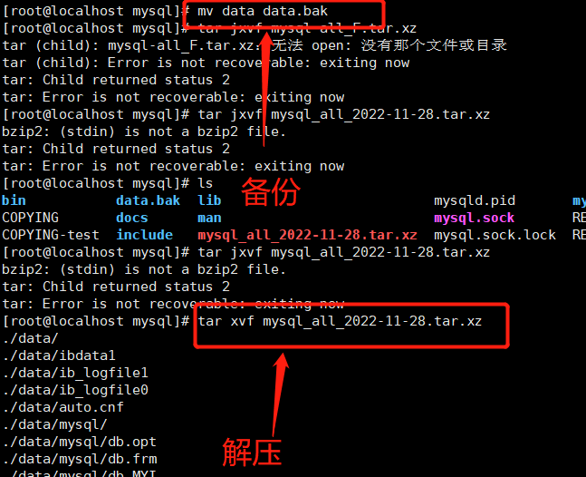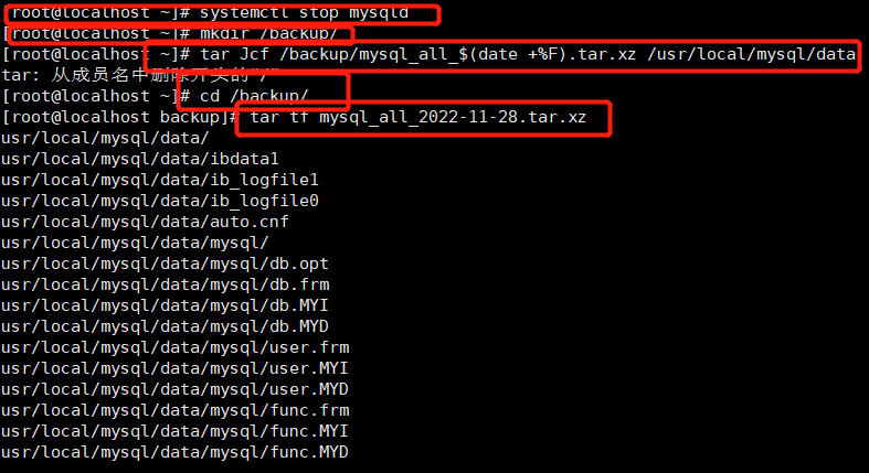 systemctl stop mysqld yum -y install xz cd /usr/local/mysql #压缩备份 tar Jcvf mysql_all_$(date +%F).tar.xz ./data #解压恢复 tar Jxvf /opt/mysql_all_2022-11-28.tar.xz