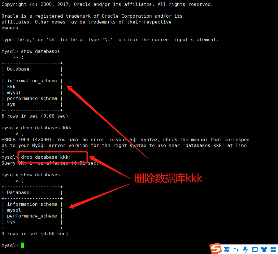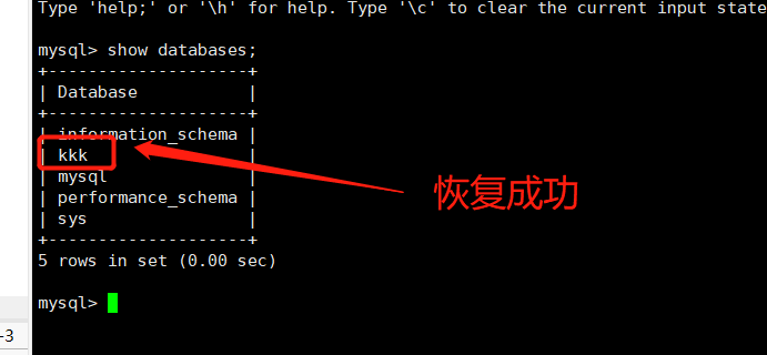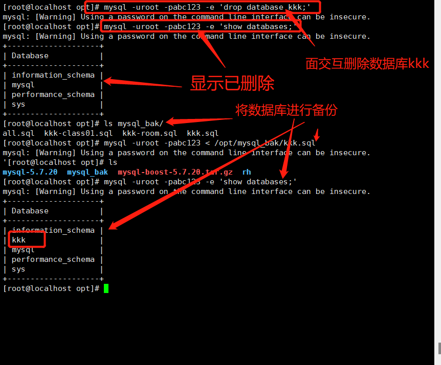 mysql -u root -p -e 'drop database kkk;' #“-e”选项,用于指定连接 MySQL 后执行的命令,命令执行完后自动退出 mysql -u root -p -e 'SHOW DATABASES;' mysql -u root -p < /opt/mysql_bak/kkk.sql mysql -u root -p -e 'SHOW DATABASES;'