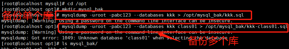 mysqldump -u root -p --databases kkk > /opt/mysql_bak/kkk.sql mysqldump -u root -p --databases kkk school > /opt/mysql_bak/kkk-school.sql