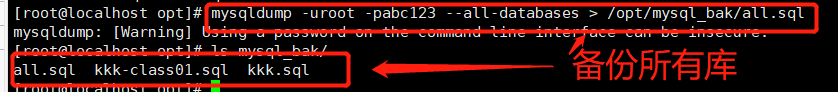 mysqldump -u root -p --all-databases > /opt/mysql_bak/all.sql