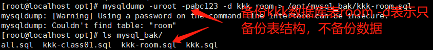 mysqldump -u root -p [-d] kkk room > /opt/mysql_bak/kkk-room.sql