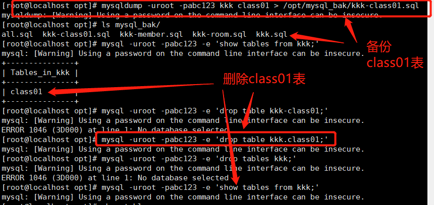 mysqldump -u root -p kkk class01 > /opt/mysql_bak/kkk-class01.sql mysql -u root -p -e 'drop table kkk.class01;'