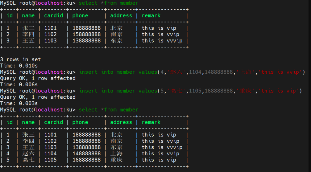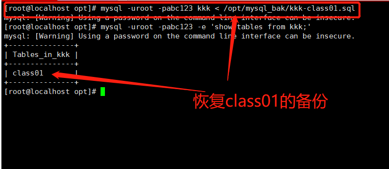 mysql -u root -p -e 'show tables from ku;' mysql -u root -p kkk < /opt/mysql_bak/kkk-class01.sql mysql -u root -p -e 'show tables from kkk;'