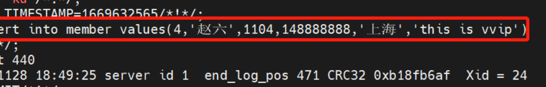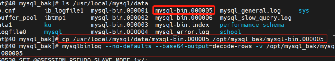 cp /usr/local/mysql/data/mysql-bin.000005 /opt/mysql_bak mysqlbinlog --no-defaults --base64-output=decode-rows -v /opt/mysql_bak/mysql-bin.000005