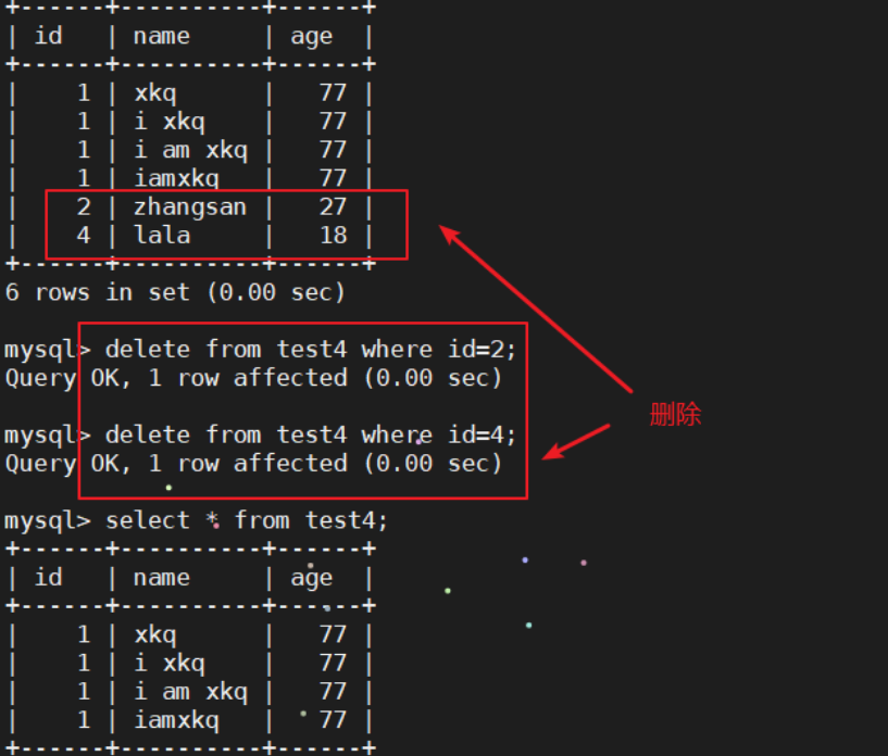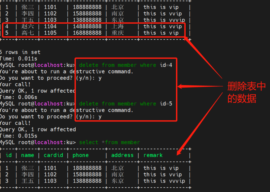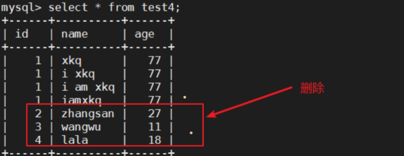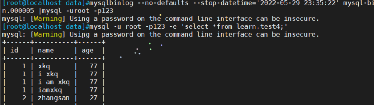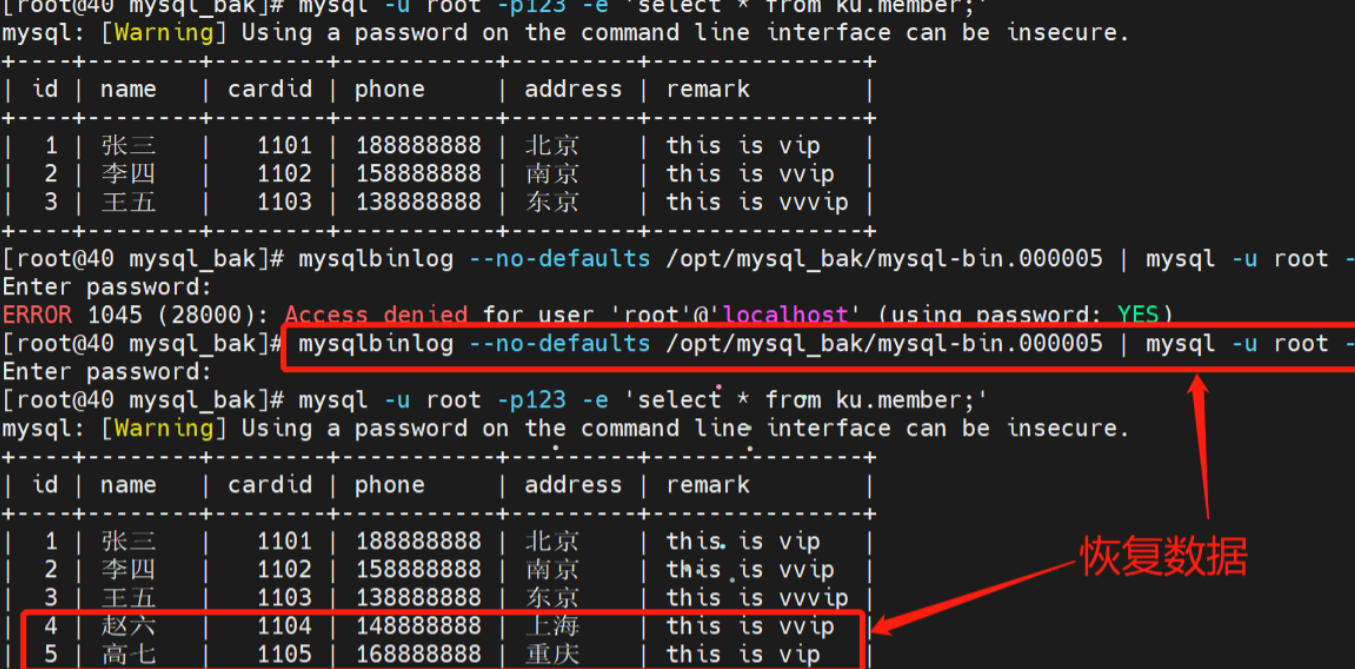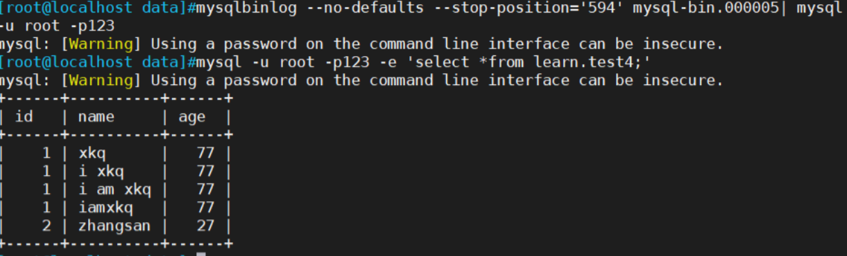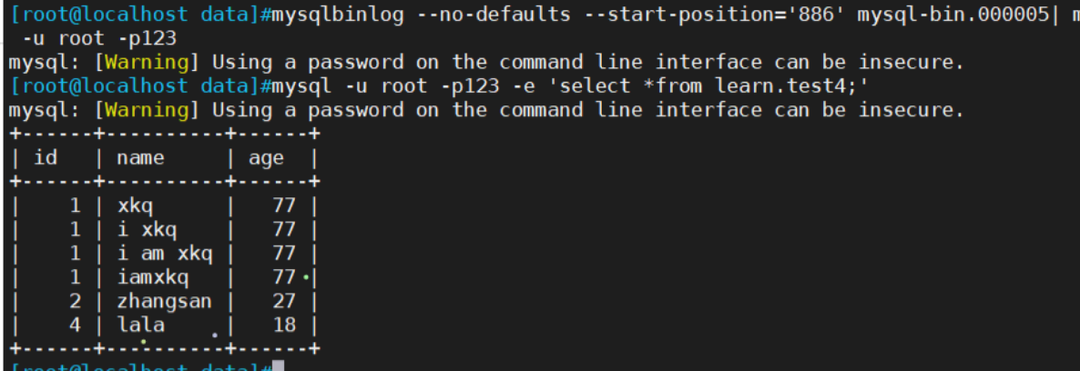 use learn; delete from member where id=4; delete from member where id=5; mysqlbinlog --no-defaults /opt/mysql_bak/mysql-bin.000005 | mysql -u root -p