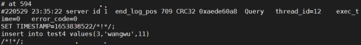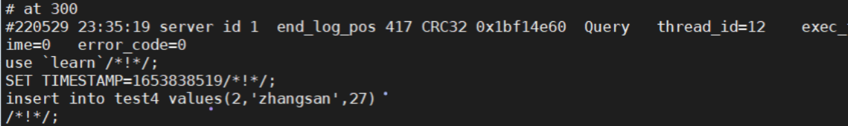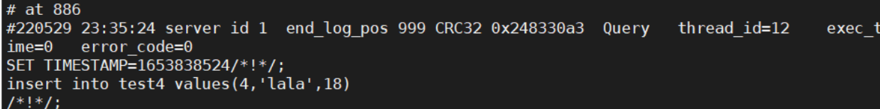 # at 300 #220529 23:35:19 server id 1 end_log_pos 417 CRC32 0x1bf14e60 Query thread_id=12 exec_time=0 error_code=0 use `learn`/*!*/; SET TIMESTAMP=1653838519/*!*/; insert into test4 values(2,'zhangsan',27) /*!*/; # at 417 #220529 23:35:19 server id 1 end_log_pos 448 CRC32 0xa5be4a31 Xid = 899 COMMIT/*!*/; # at 448 #220529 23:35:22 server id 1 end_log_pos 513 CRC32 0x6692e85f Anonymous_GTID last_committed=1 sequence_number=2 rbr_only=no SET @@SESSION.GTID_NEXT= 'ANONYMOUS'/*!*/; # at 513 #220529 23:35:22 server id 1 end_log_pos 594 CRC32 0xc07f09bf Query thread_id=12 exec_time=0 error_code=0 SET TIMESTAMP=1653838522/*!*/; BEGIN /*!*/; # at 594 #220529 23:35:22 server id 1 end_log_pos 709 CRC32 0xaede60a8 Query thread_id=12 exec_time=0 error_code=0 SET TIMESTAMP=1653838522/*!*/; insert into test4 values(3,'wangwu',11) /*!*/; # at 709 #220529 23:35:22 server id 1 end_log_pos 740 CRC32 0x0b367eab Xid = 900 COMMIT/*!*/; # at 740 #220529 23:35:24 server id 1 end_log_pos 805 CRC32 0x1069ce61 Anonymous_GTID last_committed=2 sequence_number=3 rbr_only=no SET @@SESSION.GTID_NEXT= 'ANONYMOUS'/*!*/; # at 805 #220529 23:35:24 server id 1 end_log_pos 886 CRC32 0xcfd5f910 Query thread_id=12 exec_time=0 error_code=0 SET TIMESTAMP=1653838524/*!*/; BEGIN /*!*/; # at 886 #220529 23:35:24 server id 1 end_log_pos 999 CRC32 0x248330a3 Query thread_id=12 exec_time=0 error_code=0 SET TIMESTAMP=1653838524/*!*/; insert into test4 values(4,'lala',18) /*!*/;