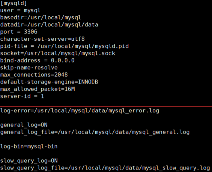log-error=/usr/local/mysql/data/mysql_error.log general_log=ON general_log_file=/usr/local/mysql/data/mysql_general.log log-bin=mysql-bin binlog_format = MIXED slow_query_log=ON slow_query_log_file=/usr/local/mysql/data/mysql_slow_query.log long_query_time=5