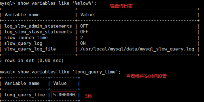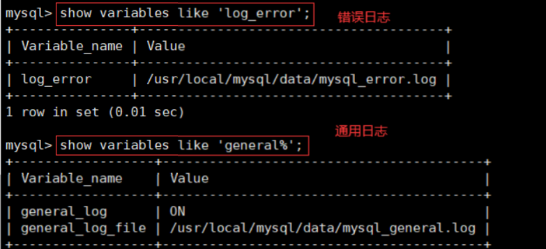 mysql -u root -p[密码] #查看错误日志存放位置 show variables like 'log_error'; #查看通用查询日志是否开启 show variables like 'general%'; #查看二进制日志是否开启 show variables like 'log_bin%'; #查看慢查询日功能是否开启 show variables like '%slow%'; #查看慢查询时间设置 show variables like 'long_query_time'; #在数据库中设置开启慢查询的方法,即以修改变量值的方式开启。但重启服务后会失效。 set global slow_query_log=ON;