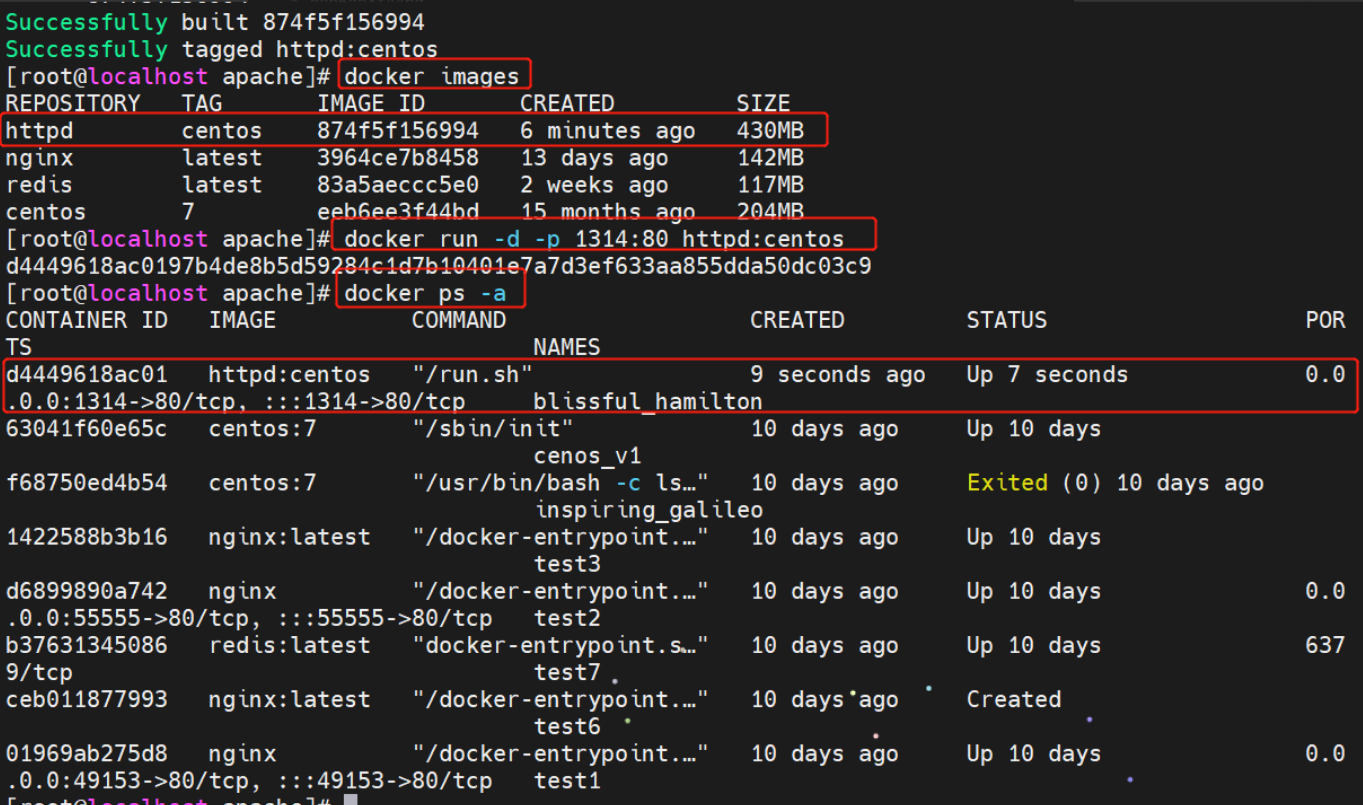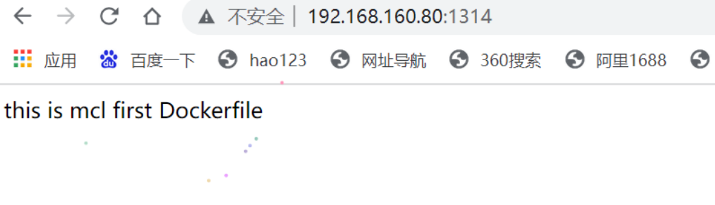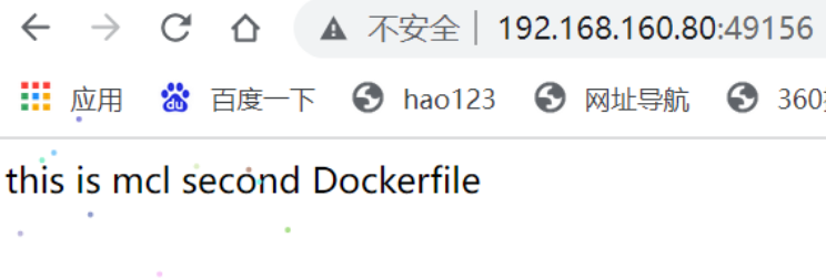 cd /opt/ #建立工作目录 mkdir /opt/apache cd apache/ vim Dockerfile #基于的基础镜像 FROM centos:7 #维护镜像的用户信息 MAINTAINER this is apache image <mcl> #镜像操作指令安装Apache软件 RUN yum install -y httpd #开启80端口 EXPOSE 80 #复制网站首页文件 ADD index.html /var/www/html/ ##方法一: ----------------------------------------------------------------------------- #将执行脚本复制到镜像中 ADD run.sh /run.sh RUN chmod +x /run.sh #启动时执行脚本 CMD ["/run.sh"] ----------------------------------------------------------------------------- ##方法二: ----------------------------------------------------------------------------- ENTRYPOINT [ "/usr/sbin/apachectl" ] CMD ["-D","FOREGROUND"] ———————————————— ##准备执行脚本 vim run.sh #!/bin/bash rm -rf /run/httpd/* #清理httpd的缓存 /usr/sbin/apachectl -D FOREGROUN #指定为前台运行 #因为Docker容器仅在它的1号进程(PID为1) 运行时,会保持运行。如果1号进程退出了,Docker容 器也就退出了。 //准备网站页面 echo "this is test dockerfile web" > index.html //生成镜像 docker build -t httpd:centos7 . #注意!!!末尾的“.”不要忘记 //新镜像运行容器 docker run -d -p 1314:80 httpd:centos7 #大写P随机端口,小写P指定端口 //浏览器访问测试 192.168.160.80:1314